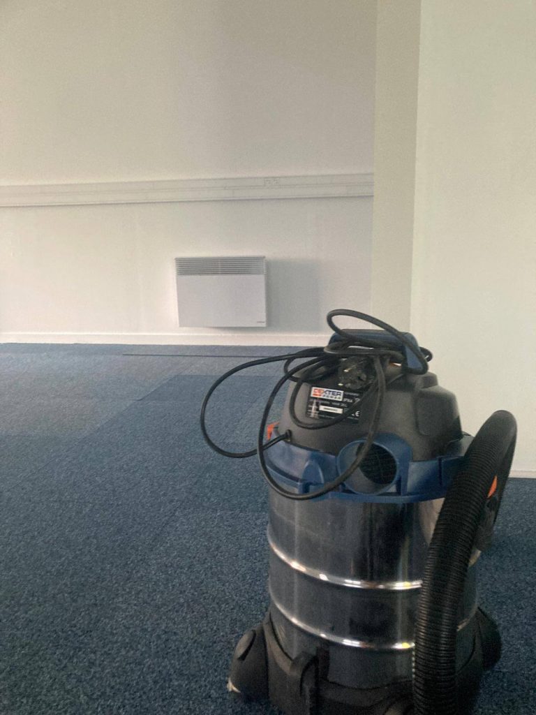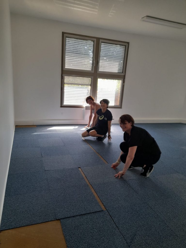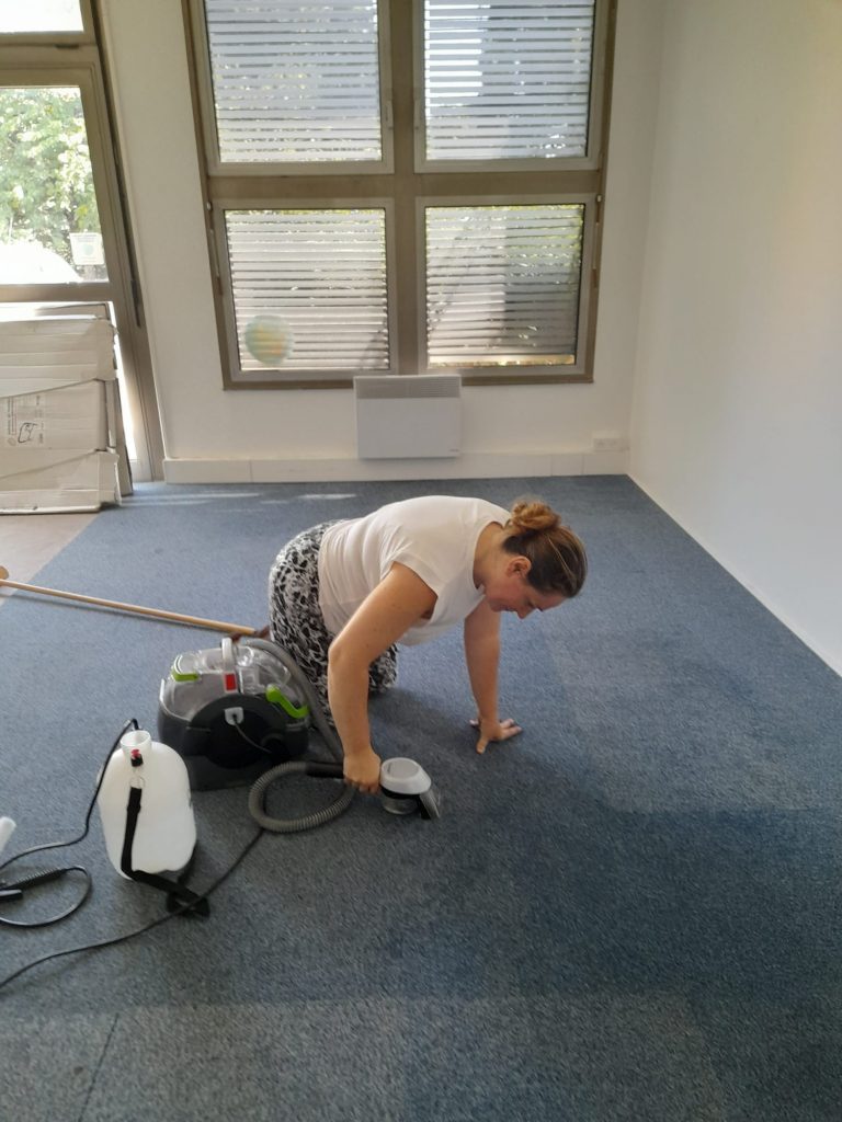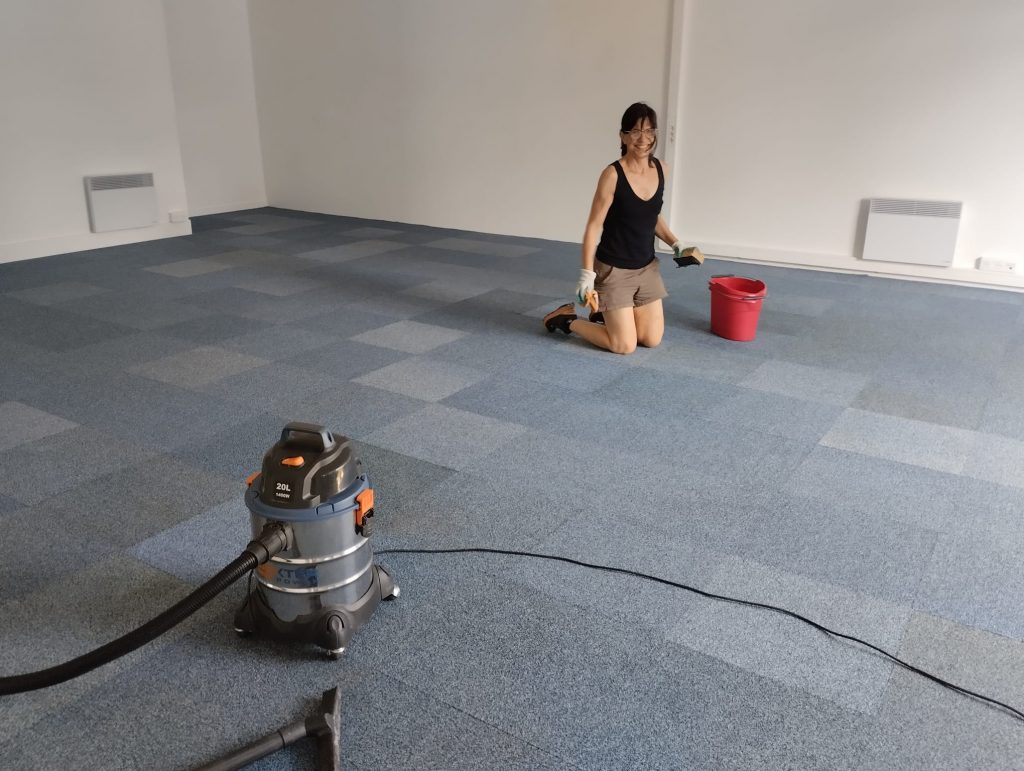 Après avoir nettoyé , frotté et joué au puzzle avec les carrés de moquette pour rendre le local propre